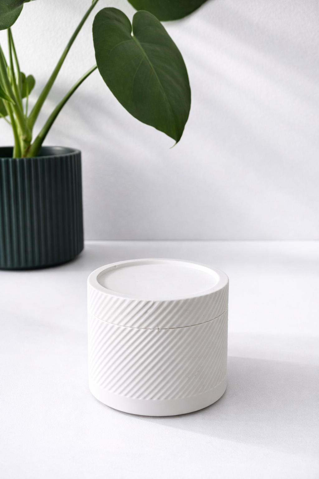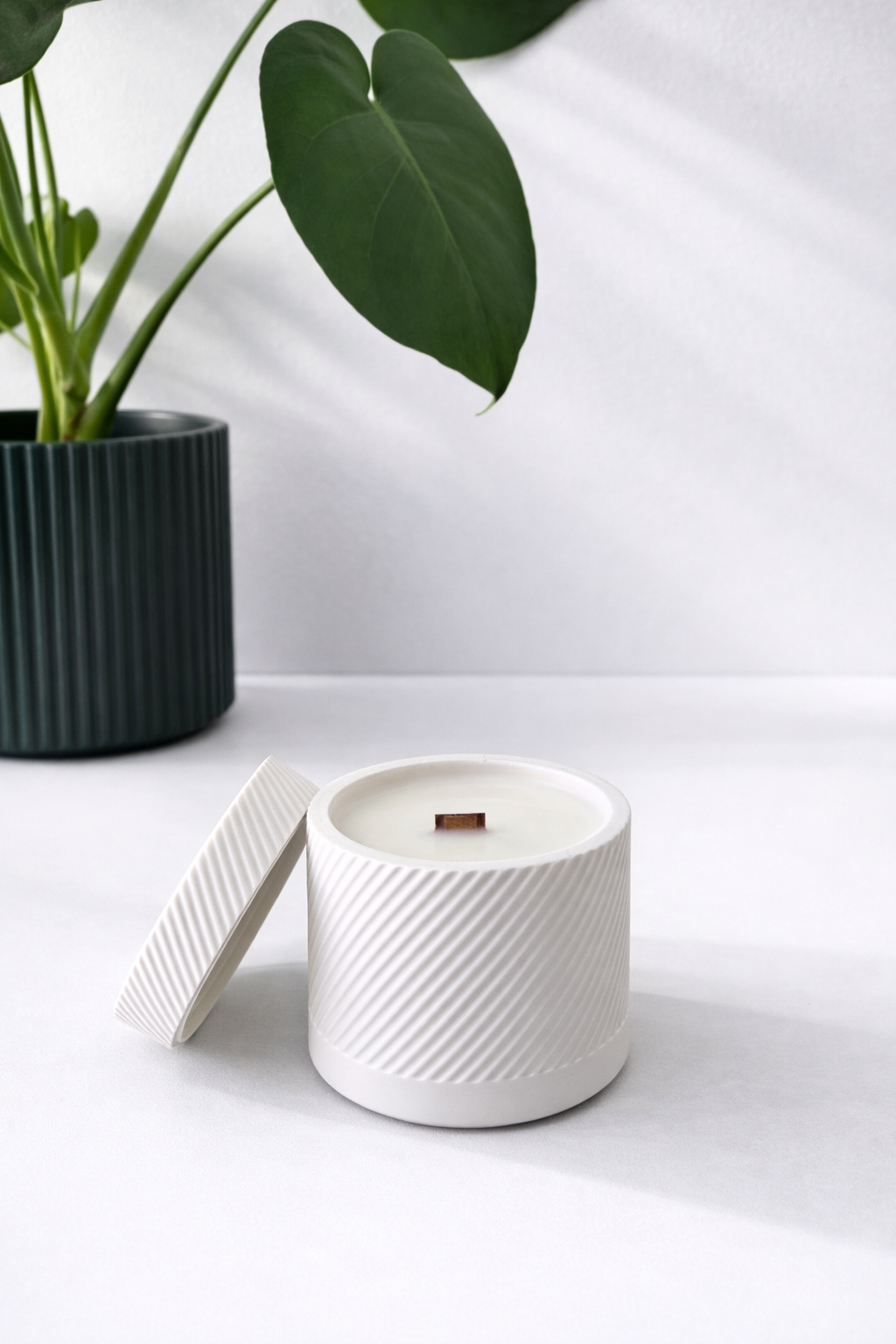 Presentada en un recipiente de resina natural hecho a mano, cada pieza tiene acabados únicos que la convierten en un objeto decorativo además de sensorial.