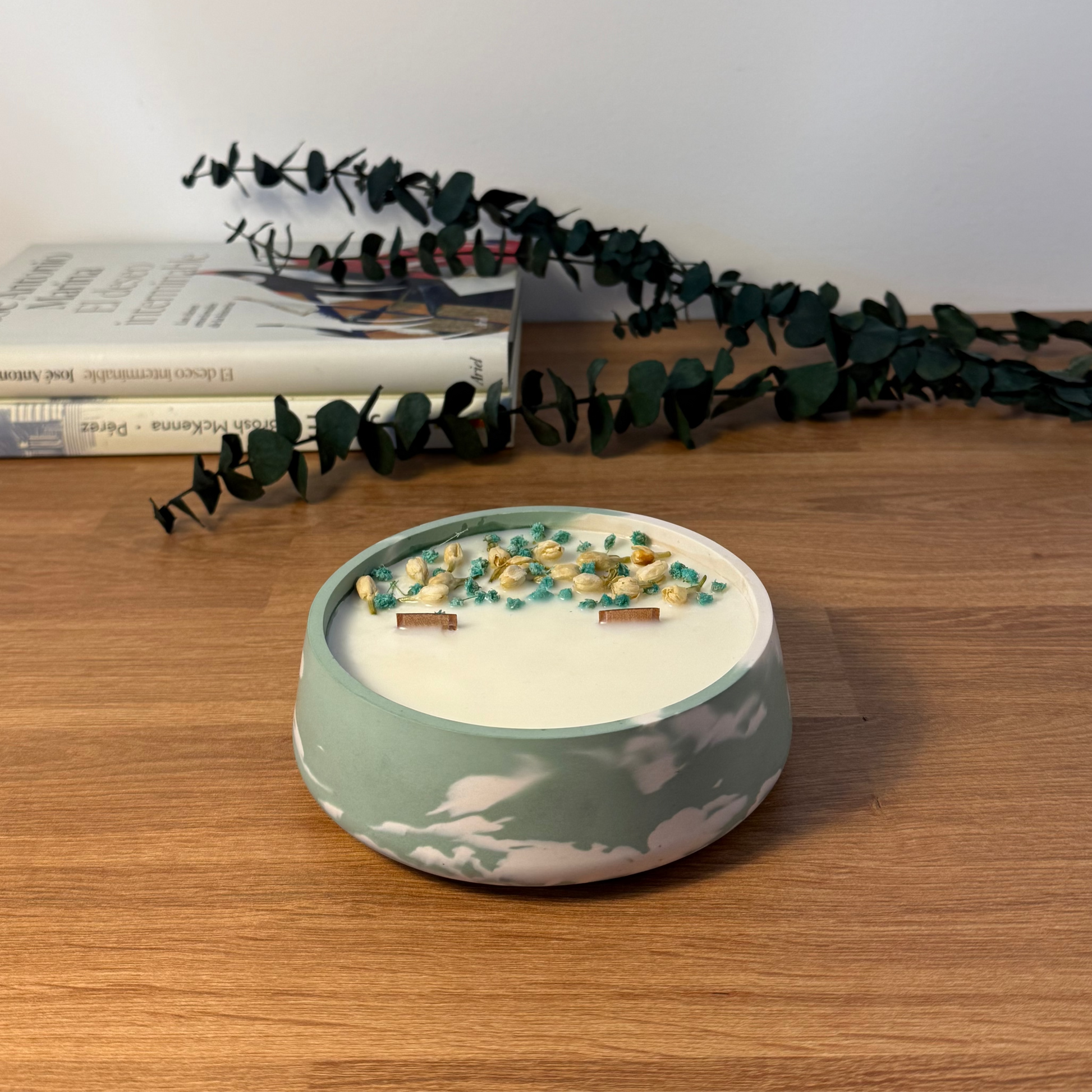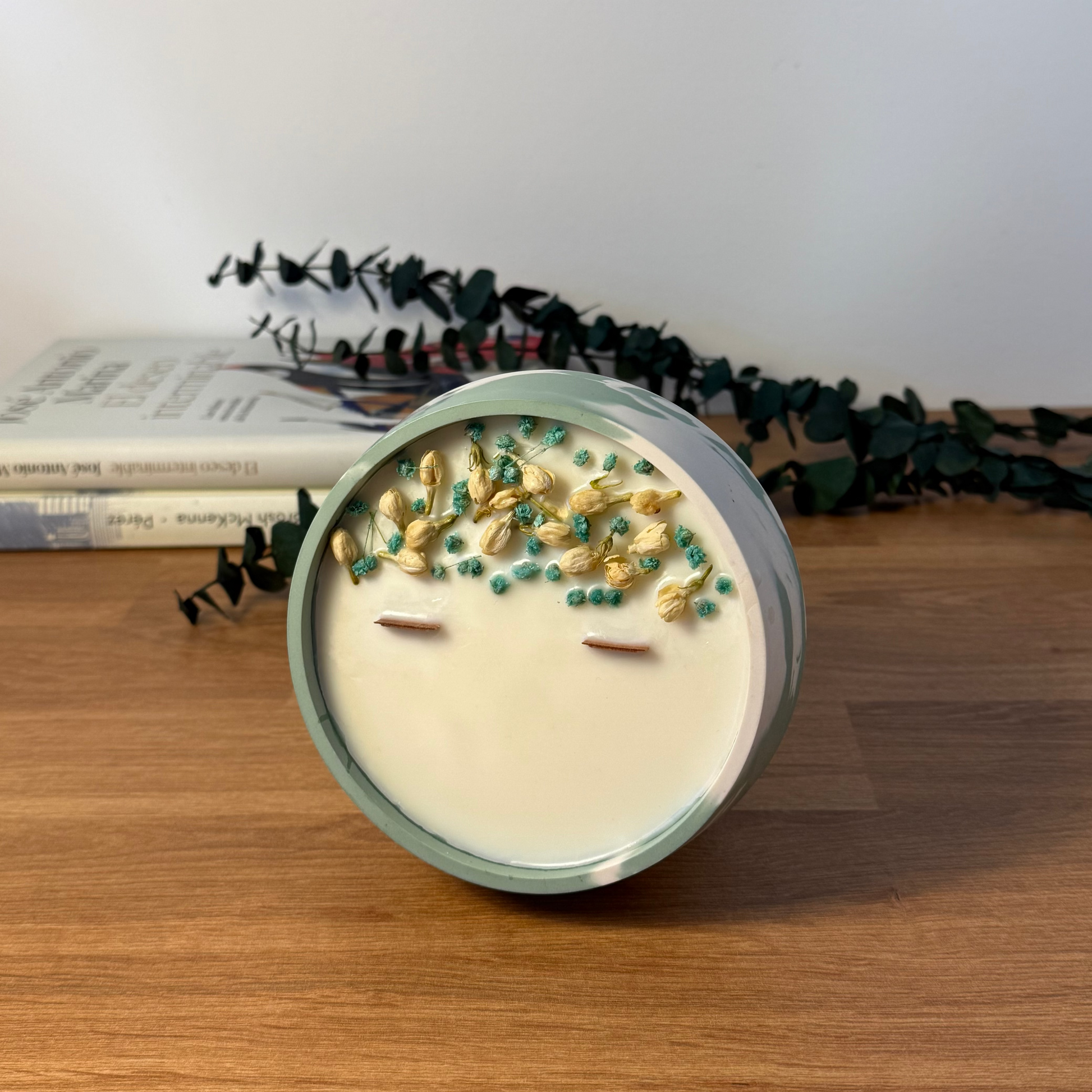 Nota: Esta vela siempre va decorada con flores secas o preservadas, la decoración puede variar, pero solemos usar flores que encajen con el color o algunas de las notas olfativas de la vela.