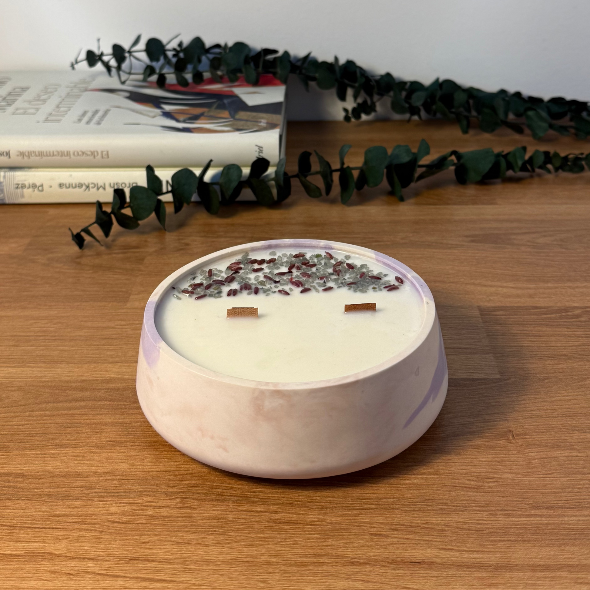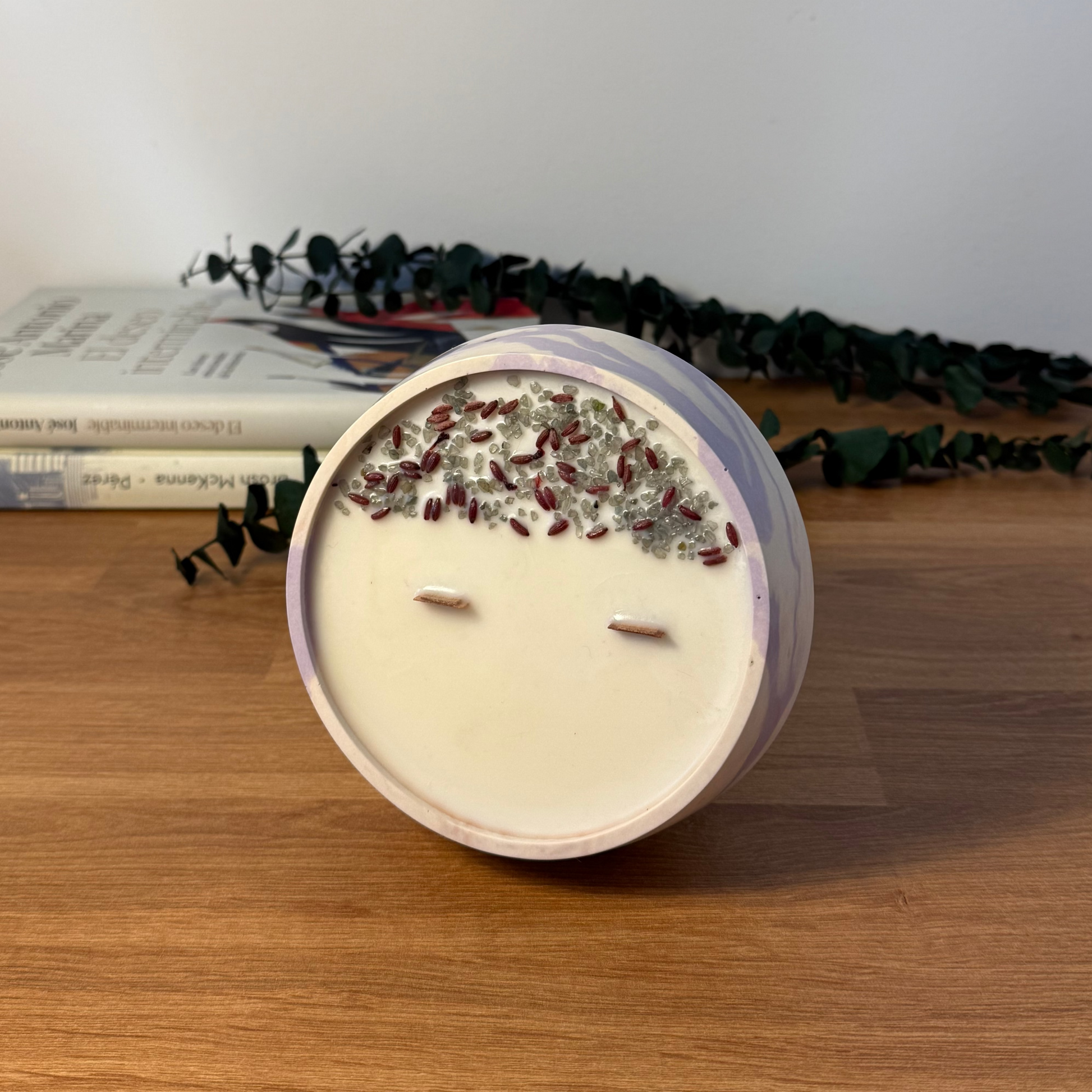 Nota: Esta vela siempre va decorada con flores secas o preservadas, la decoración puede variar, pero solemos usar flores que encajen con el color o algunas de las notas olfativas de la vela.