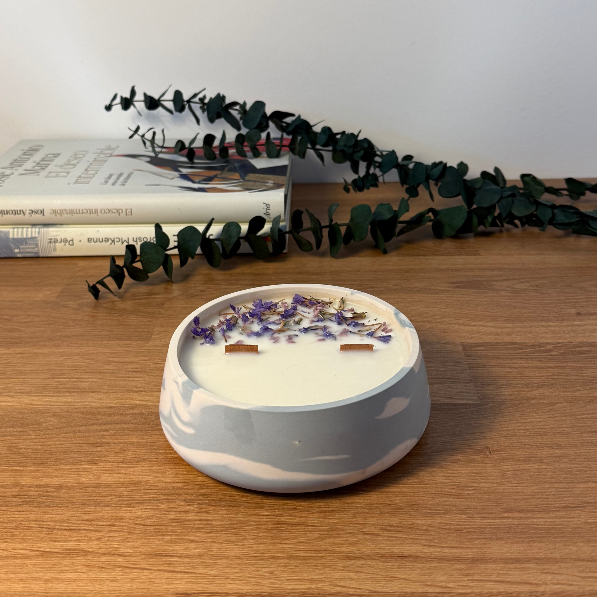 Nota: Esta vela siempre va decorada con flores secas o preservadas, la decoración puede variar, pero solemos usar flores que encajen con el color o algunas de las notas olfativas de la vela.