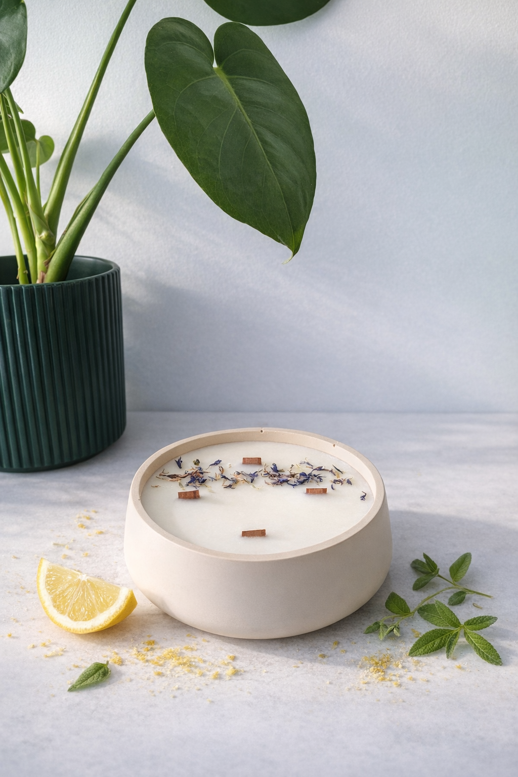 Presentada en un recipiente de resina en tono arena, con cuatro mechas de madera que aportan una combustión uniforme y una presencia cálida, se convierte en una pieza que acompaña sin ruido.